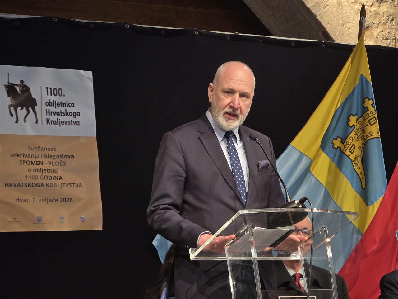 Grad Hvar - Predsjednik Odbora za vanjsku politiku i izaslanik predsjednika Hrvatskoga sabora Andro Krstulović Opara sudjelovao je u subotu na svečanosti otkrivanja i blagoslova Spomen-ploče posvećene velikom jubileju hrvatske povijesti – 1100 godina Hrvatskoga kraljevstva, autorskoga djela akademika Kuzme Kovačića, predsjednika Ogranka Matice hrvatske u Hvaru te jednog od organizatora svečanosti uz Grad Hvar i gradonačelnika Šimu Ravlića. Svečanosti je nazočio i župan Splitsko-dalmatinske županije Blaženko Boban, kao izaslanik predsjednika Vlade Republike Hrvatske.