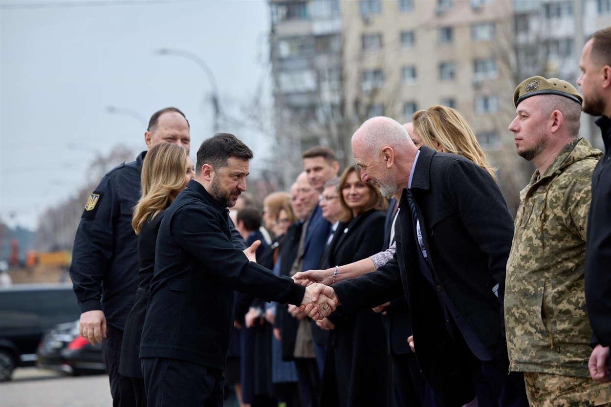 Sudionici su uz predsjednika Ukrajine Volodimira Zelenskog i predsjednice Vlade Ukrajine Julije Sviridenko upalili svijeće i odali počast žrtvama na spomeniku pokraj crkve sv. Andrije u Buči, mjestu sjećanja na jedan od najtežih ratnih zločina počinjenih tijekom ruske agresije na Ukrajinu. Tijekom okupacije toga grada 2022. godine ruske su snage počinile masovna ubojstva civila, mučenja, silovanja i druga teška kršenja međunarodnog humanitarnog prava, pri čemu je ubijeno više od petsto osoba, dok se sudbina dijela stanovnika još uvijek nastoji otkriti.