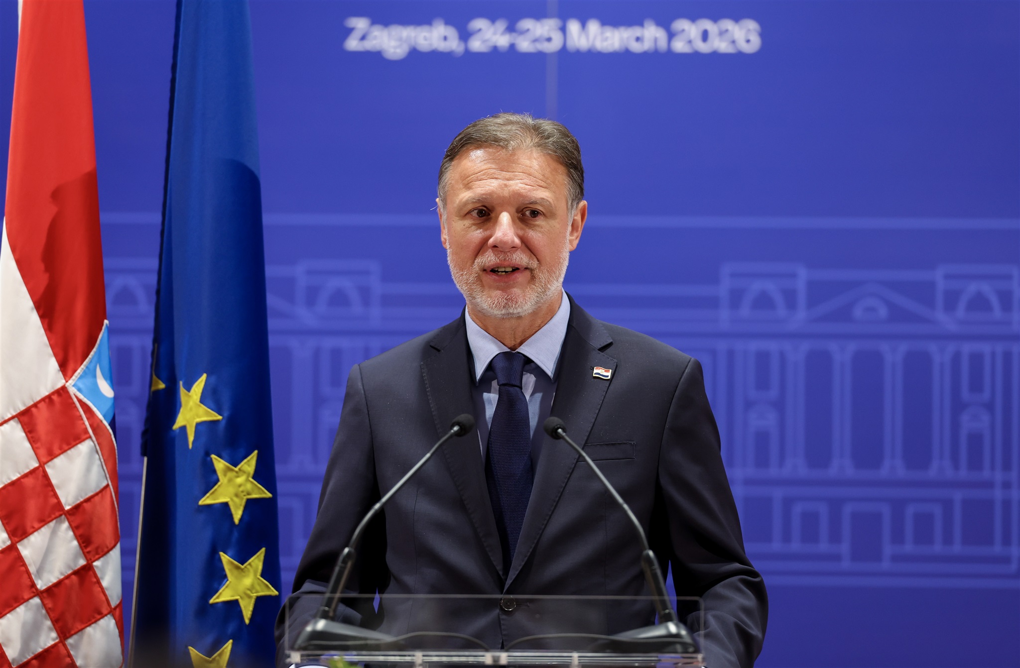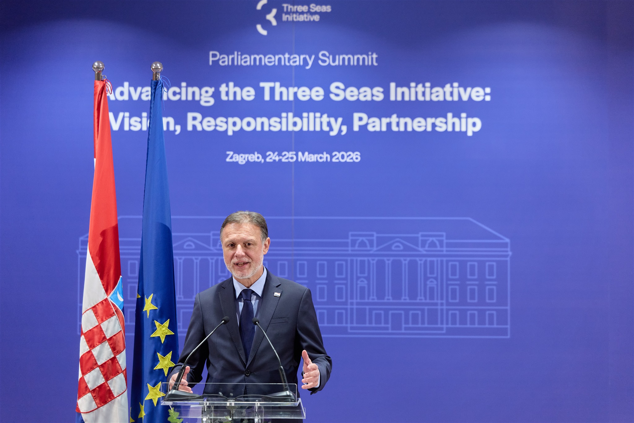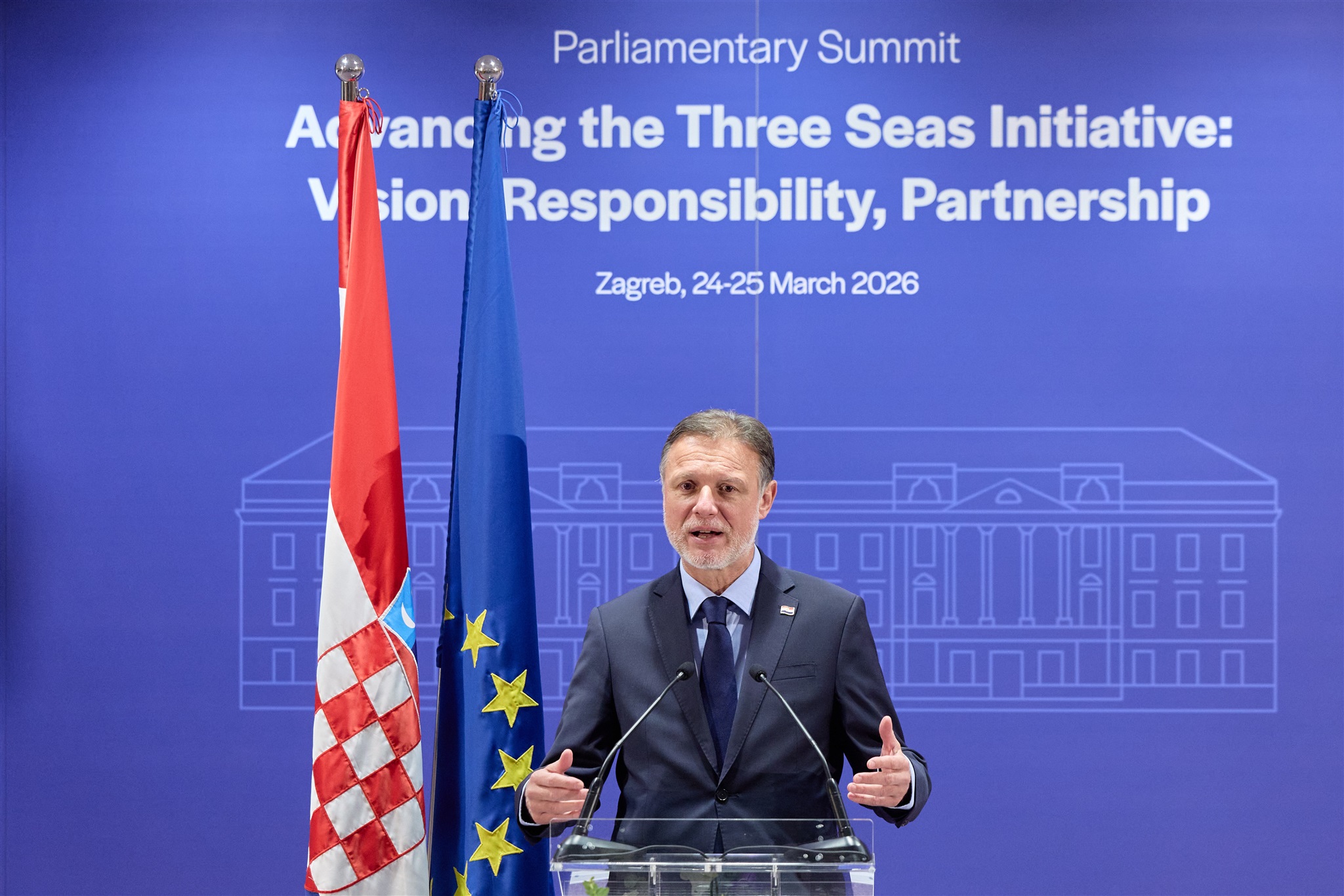 Parlamentarni summit Inicijative triju mora - konferencija za medije predsjednika Hrvatskoga sabora Gordana Jandrokovića, Nacionalna i sveučilišna knjižnica, Zagreb, 25. ožujka 2026.