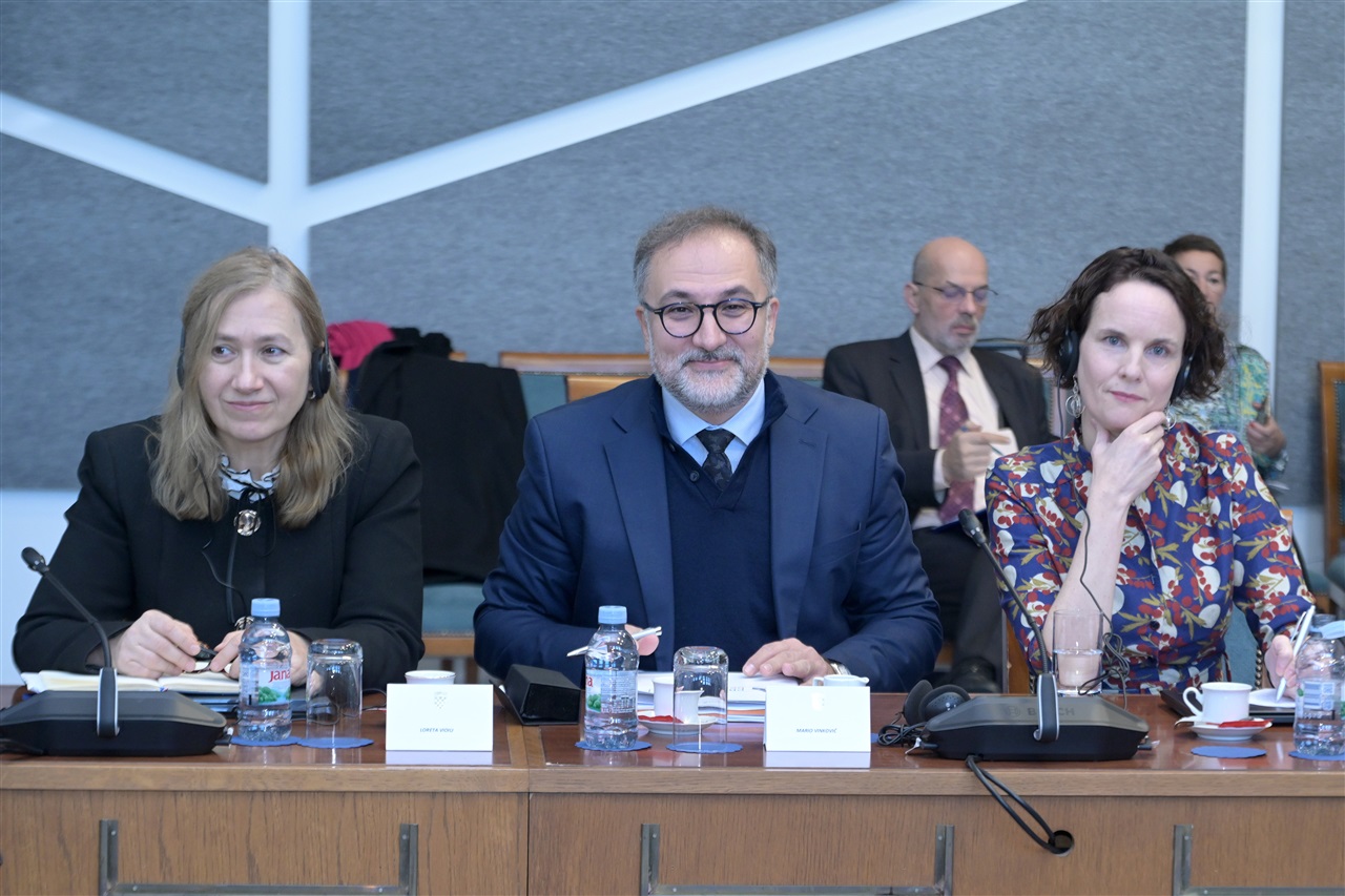 Zagreb - Voditelj Izaslanstva Hrvatskoga sabora u Parlamentarnoj skupštini Vijeća Europe Marko Pavić i članica Zdravka Bušić, član Odbora za rad, mirovinski sustav i socijalno partnerstvo Veselko Gabričević, predsjednik Odbora za ljudska prava i prava nacionalnih manjina Milorad Pupovac, potpredsjednica Sanja Bježančević i član Veljko Kajtazi te članica Odbora za zdravstvo i socijalnu politiku Martina Vlašić Iljkić održali su u petak sastanak s izaslanstvom Europskog odbora za socijalna prava Parlamentarne skupštine Vijeća Europe (ECSR) predvođeno predsjednicom Aoife Nolan.