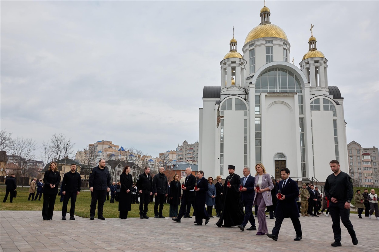 Sudionici su uz predsjednika Ukrajine Volodimira Zelenskog i predsjednice Vlade Ukrajine Julije Sviridenko upalili svijeće i odali počast žrtvama na spomeniku pokraj crkve sv. Andrije u Buči, mjestu sjećanja na jedan od najtežih ratnih zločina počinjenih tijekom ruske agresije na Ukrajinu. Tijekom okupacije toga grada 2022. godine ruske su snage počinile masovna ubojstva civila, mučenja, silovanja i druga teška kršenja međunarodnog humanitarnog prava, pri čemu je ubijeno više od petsto osoba, dok se sudbina dijela stanovnika još uvijek nastoji otkriti.