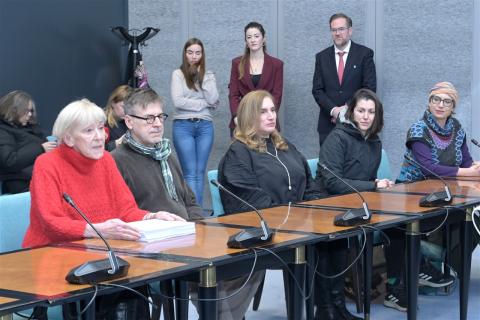 Zagreb - Predsjednica Odbora za ravnopravnost spolova Hrvatskoga sabora Marija Lugarić primila je predstavnike grupe građana, Sanju Sarnavku, Marinu Škrabalo, Tanju Dabo, Karlu Pudar i Mladena Majetića kako bi joj uručili peticiju kojom se zahtijeva zabrana molitelja na glavnim trgovima u Hrvatskoj. Peticijom je prikupljeno više od 60 tisuća potpisa.